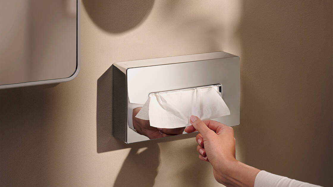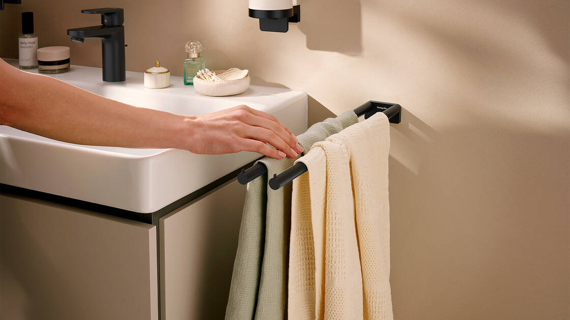 The cylindrical AddStoris S range with modern, rounded shapes looks perfect with subtly curved faucets and bathroom items for a holistic design experience. Use sophisticated details to transform your bathroom into a welcoming and harmonious place. From numerous storage options to soap dispensers with clever designs to stylish toilet paper holders, everything blends together seamlessly to simplify daily routines. AddStoris S is available in many designs in the standard hansgrohe quality.